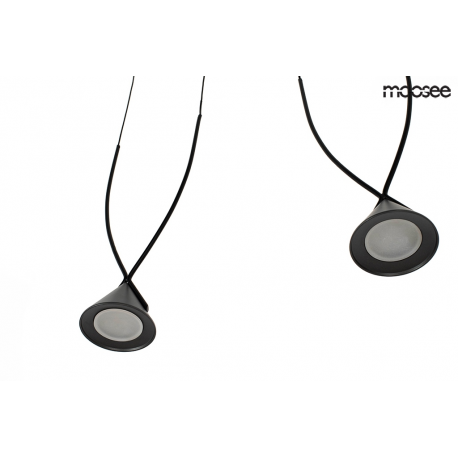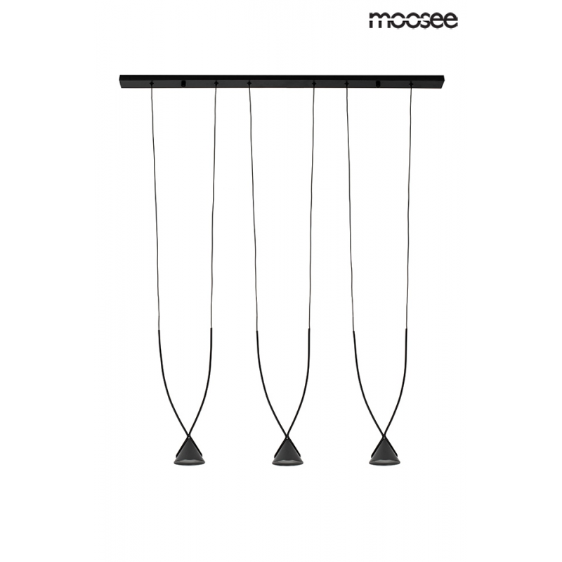 MOOSEE lampa wisząca ATLAS 3 czarna. Designerskie połączenie aluminium i metalu w kolorze czarnym. Stożkowe klosze równolegle zawieszono na podłużnej podsufitce. Dekoracyjna oprawa z trzema punktami