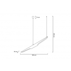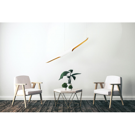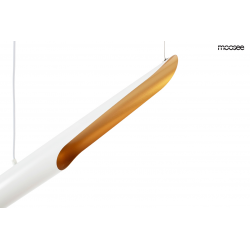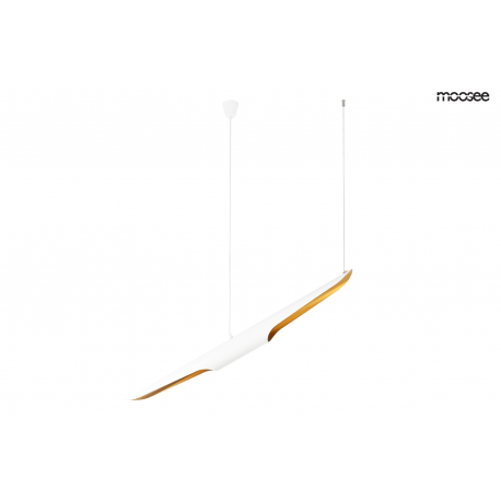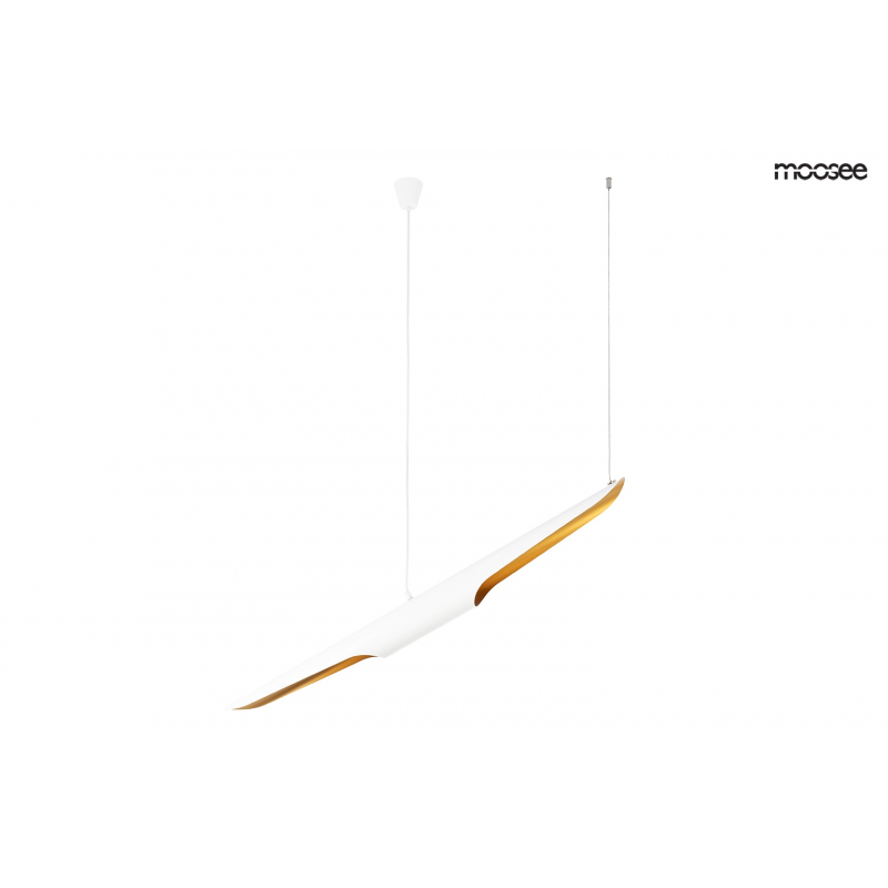 MOOSEE lampa wisząca CONTEO biała.Wykonana z formowanego aluminium lakierowanego na kolor biały. Wewnętrzna strona klosza w złotym kolorze doskonale rozprasza i „ogrzewa” światło.Całość jest zawieszona w charakterystyczny sposób na białej podsufitce, przewodzie w oplocie i stalowej lince. Conteo z powodzeniem może zawisnąć nad stołem w jadalni, barem lub recepcją w hotelu.Światło: 2 x E27 max. 40 W (brak w zestawie)Oprawa: wys. 231 cm / szer. 100 cm / gł. 10 cmKlosz: dł. 100 cm / śr. 8 cmMocowanie: śr. 10 cm / wys. 11 cmElement mocowania linek do sufitu: wys. 3,5 cm / śr. 1,5 cmPrzewód: 170 cmMontaż: instalacja sufitowaWaga: 1,5 kgWymiary opakowania: 107 cm / 23 cm / 17 cm.