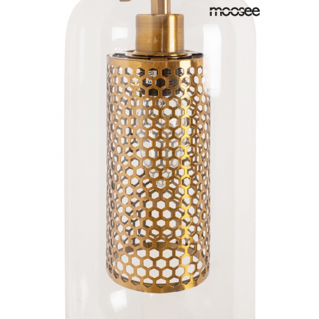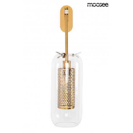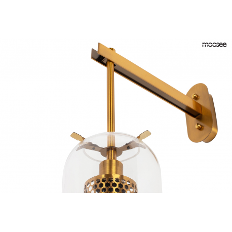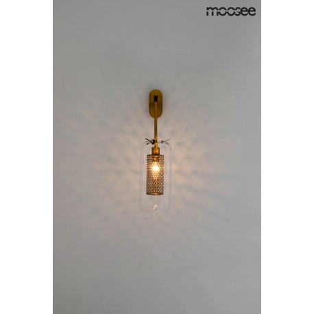MOOSEE lampa ścienna LAMPION złota. Kinkiet wyglądem przypomina elegancki lampion, który został wykonany z połączenia stali w kolorze złotym oraz transparentnego szklanego klosza. Ażurowe wykończeni