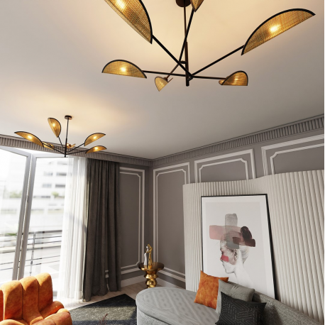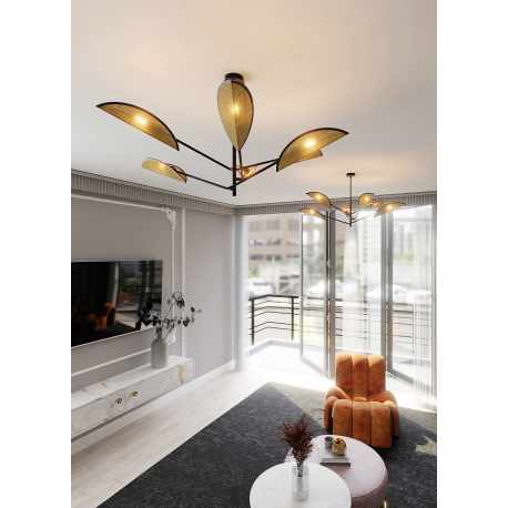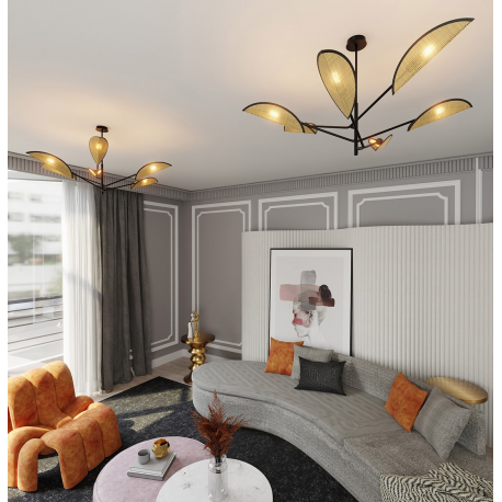 Lampa sufitowa VENE zachwyca lekkością i subtelnością. Idealnie wpasuje się w gusta klientów, ceniących sobie wyjątkowe materiały i oryginalny design w stylu etno. Wyjątkowe bażury w kształcie liści dodają lampie niezwykłej delikatności. Lampa sufitowa VENE doskonale ociepli wnętrze Twojego domu, tworząc przytulną atmosferę. Najlepiej prezentuje się w salonie lub sypialni i z pewnością przykuje uwagę wszystkich gości. Otwarte abażury doskonale oświetlą pomieszczenie, tworząc niepowtarzalny klimat. Wykonana z najwyższej jakości materiałów. Produkt w 100% polski. Dostępna w wersji na 2, 4 lub 6 źródeł światła. Abażury czarno-złote, biało-złote lub rattanowe.