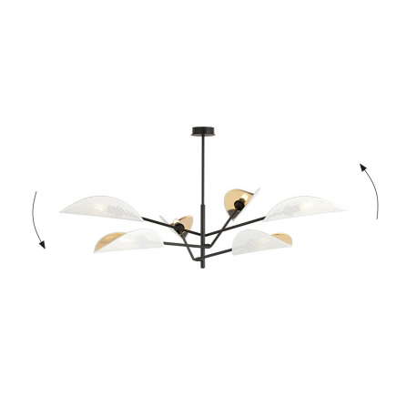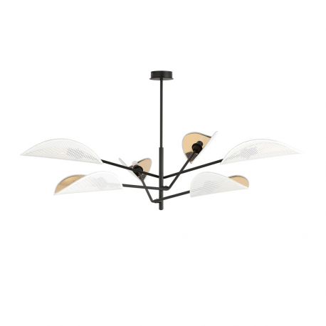 Lampa sufitowa VENE zachwyca lekkością i subtelnością. Idealnie wpasuje się w gusta klientów, ceniących sobie wyjątkowe materiały i oryginalny design w stylu etno. Wyjątkowe bażury w kształcie liści dodają lampie niezwykłej delikatności. Lampa sufitowa VENE doskonale ociepli wnętrze Twojego domu, tworząc przytulną atmosferę. Najlepiej prezentuje się w salonie lub sypialni i z pewnością przykuje uwagę wszystkich gości. Otwarte abażury doskonale oświetlą pomieszczenie, tworząc niepowtarzalny klimat. Wykonana z najwyższej jakości materiałów. Produkt w 100% polski. Dostępna w wersji na 2, 4 lub 6 źródeł światła. Abażury czarno-złote, biało-złote lub rattanowe.