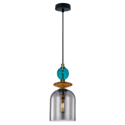 Lampa wisząca Tropea wykonana ze szkła z metalowymi elementami w kolorze postarzanego złota. Szklane elementy lampy zostały wykonane w trzech harmonizujących ze sobą kolorach: dymnym, bursztynowym i turkusowym. Kolorystyka lampy sprawia, że będzie ona widocznym elementem każdego pomieszczenia i jego niewątpliwą ozdobą. Lampa sprawdzi się w pomieszczeniach urządzonych w stylu boho, retro, vintage. Jej imponujaca długość sprawia, że znajdzie ona zastosowanie jako punkt centralny jadalni. Świetnie sprawdzi się także w sypialni.