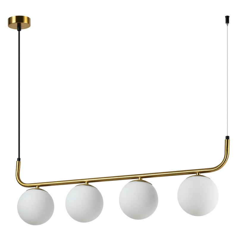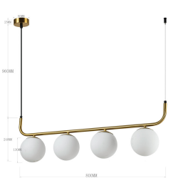 Lampa wisząca Alisa 4 została wykonana z metalu w kolorze złota oraz czterech, szklanych kloszy. Klosze lampy mają mleczną barwę dzięki czemu pięknie rozpraszają światło tworząc przytulną atmosferę. Lampa wisząca Alisa 4 będzie stanowiła oświetleniowy element dekoracyjny większości pomieszczeń. Najlepiej sprawdzi się w roli oświetlenia centralnego w salonie, jadalni, sypialni bądź kuchni. Lampa wisząca Alisa posiada cztery źródła światła na żarówki z gwintem E14.