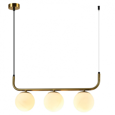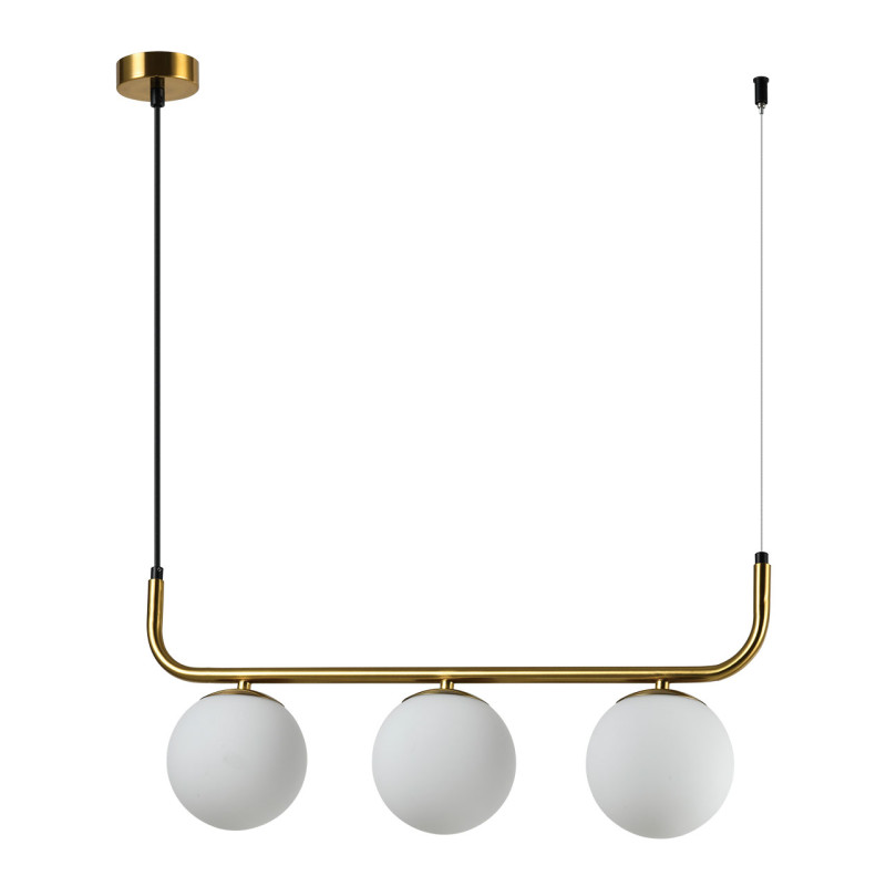 Materiał i kolorystyka: Lampa została wykonana z metalu w złotym kolorze oraz szklanych, mlecznych kloszy.