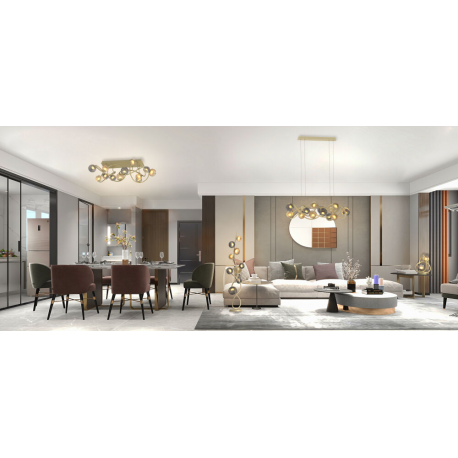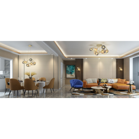 Lampa jest dostępna w eleganckim odcieniu złotym połączonym z bursztynowymi i dymionymi kloszami, który będzie pasować do każdego wystroju wnętrza.