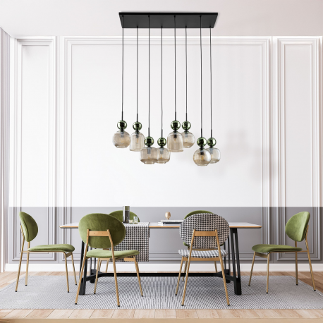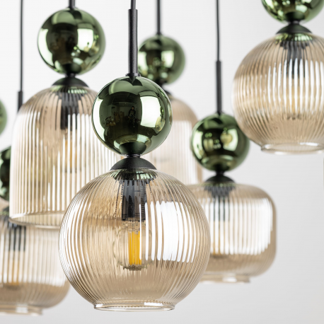 Rodzina lamp SOPHIA to wyjątkowe połączenie subtelnej formy, elegancji i funkcjonalności. Inspirowana ponadczasowym stylem glamour, zachwyca harmonijnym zestawieniem materiałów – ryflowanego szkła w różnych wykończeniach kolorystycznych (mlecznobiałym, koniakowym, zielonym), delikatnych złotych akcentów oraz smukłych, czarnych detali. To oświetlenie stworzone dla tych, którzy cenią wyrafinowany design i przytulną atmosferę. Rzeźbiarska forma ryflowanego klosza subtelnie rozprasza światło, tworząc przyjemny, nastrojowy blask, a kulisty element w wykończeniu złotym lub barwnym dodaje lampie lekkości i szyku, czyniąc ją nie tylko źródłem światła, ale i dekoracyjnym akcentem wnętrza. Rodzina SOPHIA obejmuje zarówno pojedyncze lampy wiszące, kinkiety, jak i efektowne kompozycje wielopunktowe, które doskonale sprawdzą się nad stołem w jadalni, w salonie, sypialni czy eleganckich przestrzeniach komercyjnych.