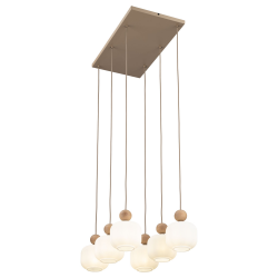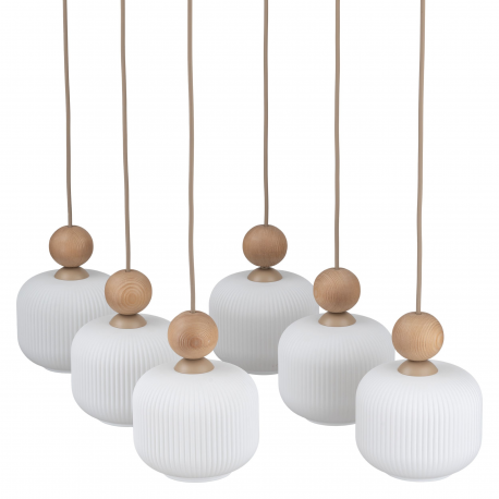 Rodzina lamp BALLO to elegancka kolekcja oświetlenia, która łączy nowoczesny styl z naturalnymi akcentami. Charakterystycznym elementem serii są ryflowane klosze z mlecznobiałego szkła, które subtelnie rozpraszają światło, tworząc przytulną atmosferę w każdym wnętrzu. Lampy zdobią także dekoracyjne, drewniane kule umieszczone nad kloszami, które wprowadzają ciepły, organiczny akcent. Całość uzupełnia podsufitka w kolorze Sabia – jasnego, piaskowego beżu, doskonale komponująca się z delikatną formą opraw. Kolekcja BALLO dostępna jest w wersjach z 1, 3, 4 i 6 źródłami światła, dzięki czemu łatwo dopasować ją do różnych przestrzeni i potrzeb aranżacyjnych.