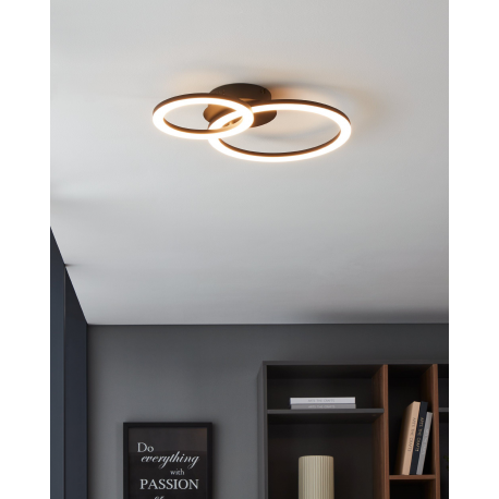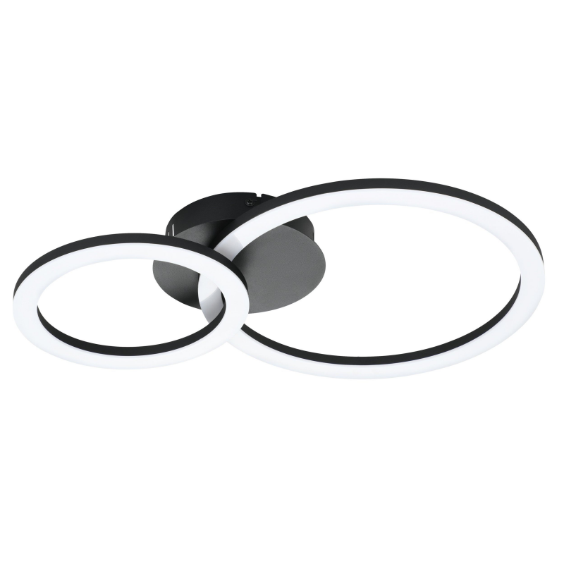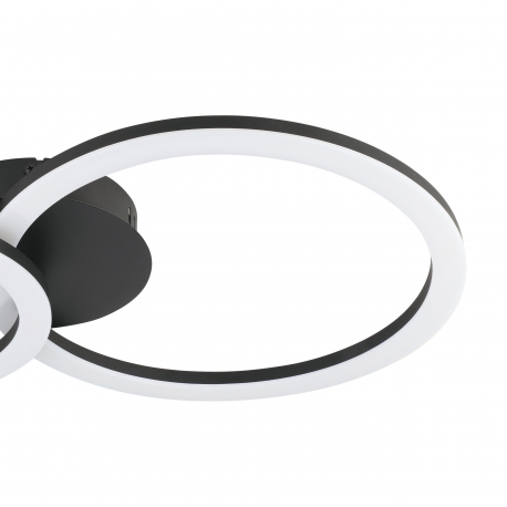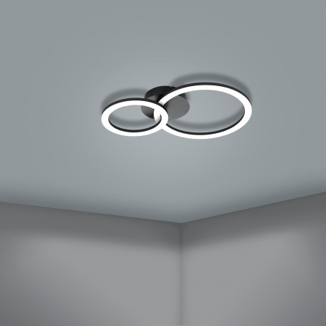 Lampa sufitowa LED PARRAPOS-Z z serii smart home connect.Z jest wykonana z dwóch czarnych, okrągłych profili LED. Różnej wielkości profile LED zostały zamocowane pośrodku okrągłej, czarnej metalowej podstawy. Zintegrowane diody LED za białymi powierzchniami świetlnymi z tworzywa sztucznego zapewniają przyjemne światło zgodnie z Twoimi życzeniami. Masz wybór między ciepłym białym, neutralnym białym i chłodnym białym światłem. Jest sterowany za pomocą bezpłatnej aplikacji (AwoX Home Control) i zapewnia dostęp do innych funkcji komfortu, takich jak ściemnianie, timer, symulacja obecności i wiele innych. Światło jest sterowane przez Bluetooth i ZigBee 3.0, a także umożliwia sterowanie za pomocą kompatybilnych asystentów głosowych. Ponadto inteligentną lampą sufitową można również sterować za pomocą dostępnego oddzielnie pilota.