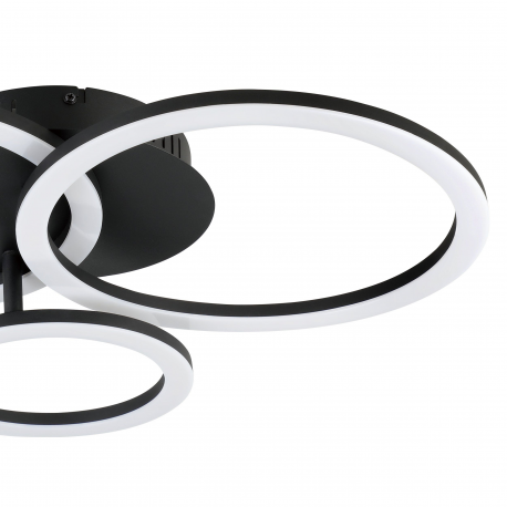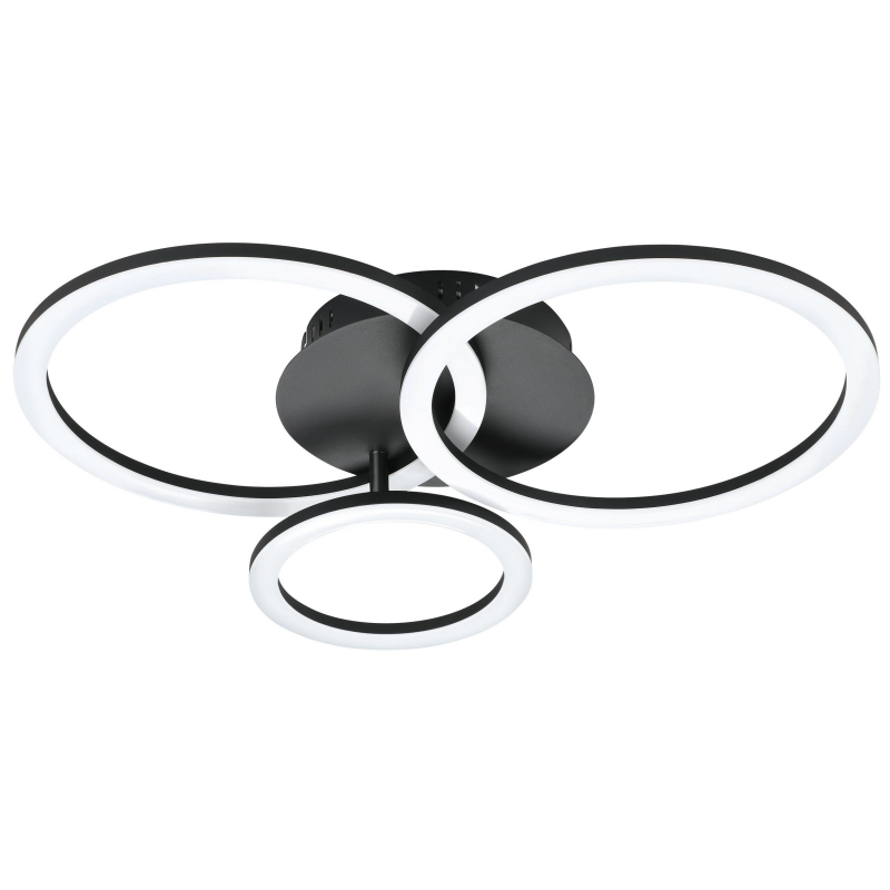 Lampa sufitowa LED PARRAPOS-Z z serii smart home connect.Z jest wykonana z trzech czarnych, okrągłych profili LED. Różnej wielkości profile LED zostały zamocowane pośrodku okrągłej, czarnej metalowej podstawy. Zintegrowane diody LED za białymi powierzchniami świetlnymi z tworzywa sztucznego zapewniają przyjemne światło zgodnie z Twoimi życzeniami. Masz wybór między ciepłym białym, neutralnym białym i chłodnym białym światłem. Jest sterowany za pomocą bezpłatnej aplikacji (AwoX Home Control) i zapewnia dostęp do innych funkcji komfortu, takich jak ściemnianie, timer, symulacja obecności i wiele innych. Światło jest sterowane przez Bluetooth i ZigBee 3.0, a także umożliwia sterowanie za pomocą kompatybilnych asystentów głosowych. Ponadto inteligentną lampą sufitową można również sterować za pomocą dostępnego oddzielnie pilota.