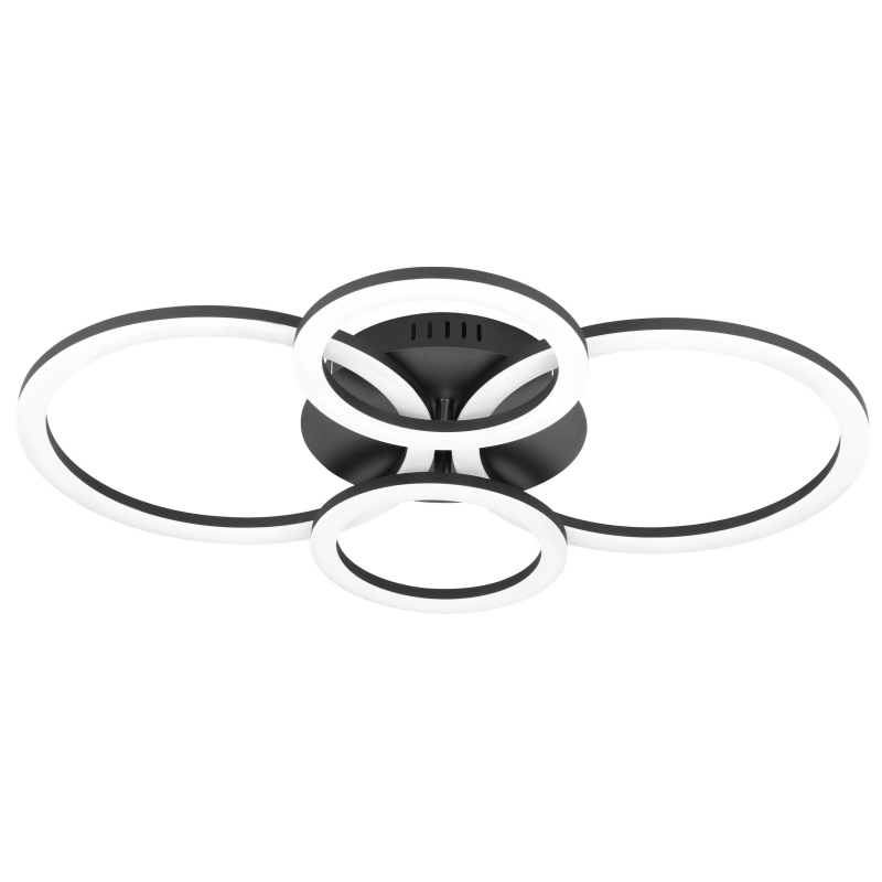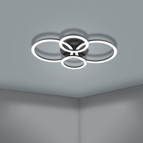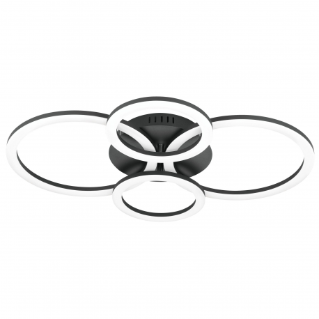 Lampa sufitowa LED PARRAPOS-Z z serii smart home connect.Z jest wykonana z czterech czarnych, okrągłych profili LED. Różnej wielkości profile LED zostały zamocowane pośrodku okrągłej, czarnej metalowej podstawy. Zintegrowane diody LED za białymi powierzchniami świetlnymi z tworzywa sztucznego zapewniają przyjemne światło zgodnie z Twoimi życzeniami. Masz wybór między ciepłym białym, neutralnym białym i chłodnym białym światłem. Jest sterowany za pomocą bezpłatnej aplikacji (AwoX Home Control) i zapewnia dostęp do innych funkcji komfortu, takich jak ściemnianie, timer, symulacja obecności i wiele innych. Światło jest sterowane przez Bluetooth i ZigBee 3.0, a także umożliwia sterowanie za pomocą kompatybilnych asystentów głosowych. Ponadto inteligentną lampą sufitową można również sterować za pomocą dostępnego oddzielnie pilota.