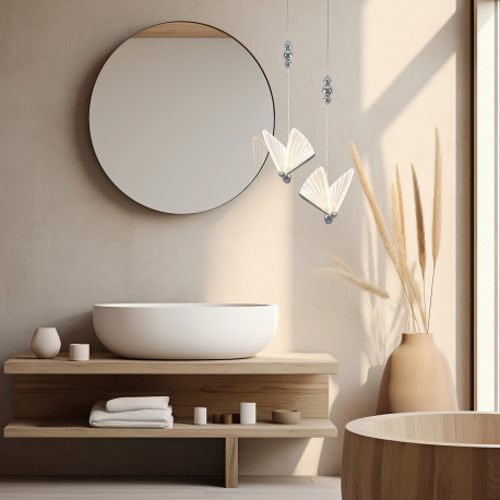 Lampy Mariposa wyróżniają się niepowtarzalnym designem, posiadając klosze w kształcie motyli, które są prawdziwą ozdobą każdego wnętrza. Światło LED, subtelnie umieszczone w skrzydłach, tworzy delikatny i elegancki efekt świetlny. Chromowane elementy z metalu harmonijnie współgrają z lśniącymi skrzydłami, dodając lampie nowoczesnego i stylowego charakteru. Ta starannie zaprojektowana lampa nie tylko oświetla przestrzeń, ale także wnosi do niej wyjątkową atmosferę spokoju i harmonii, tworząc ciepłą i przytulną aurę. Lampy Mariposa to niezastąpiony element dekoracyjny, który doskonale uzupełnia zarówno nowoczesne, jak i klasyczne aranżacje wnętrz.