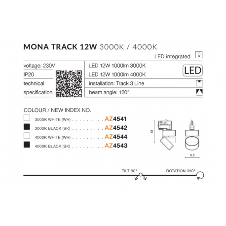 MONA LED 12W 3000k LAMPA DO 3-fazowego SZYNOPRZEWODU AZZARDO AZ4542
