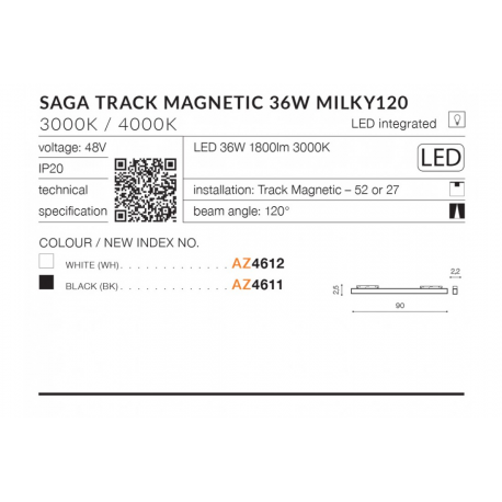 Saga 30 track magnetic corner A 24W milky 120 to metalowa listwa, wygięta pod kątem 90 stopni. W jej wnętrzu osadzono pojedyncze, mocno wydłużone źródło światła LED, o niskim zużyciu energii i dużej żywotności. Z zewnątrz okrywa je mlecznobiała osłona, przyjemnie rozpraszająca światło. W naszej ofercie lampa występuje w dwóch wersjach kolorystycznych (czarnej i białej), dzięki czemu da się ją łatwo połączyć z innymi akcesoriami do szynoprzewodów, dostępnymi na stronie Azzardo. Lampa jest przeznaczona do montażu na szynoprzewodach jednofazowych magnetycznych.