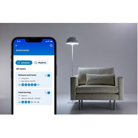 Wystarczy podłączyć nowe urządzenie WiZ do sieci Wi-Fi, aby z łatwością korzystać ze wszystkich funkcji inteligentnego domu. Teraz możesz sterować oświetleniem i urządzeniami z dowolnego miejsca. Możesz nawet ustawiać harmonogramy, aby automatycznie włączać i wyłączać światła. I nie musisz instalować dodatkowego sprzętu, takiego jak koncentrator czy brama dostępu do sieci!